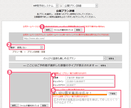 お客様が見る【プラン詳細・空室状況】画面等に表示されます。